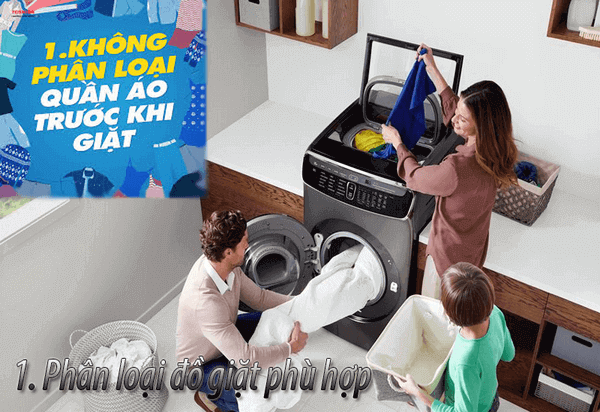 - Khi cho đồ giặt các bạn có thể phân loại đồ theo các tiêu chí khác nhau như: màu sắc, độ dày. Nên rũ tơi hết quần áo trang phục trước khi cho vào máy giặt, tốt nhất nên cho giặt với lượng quần áo vừa đủ khoảng sấp sỉ số cân theo trọng lượng của máy hoặc khoảng 2/3 so với thùng giặt