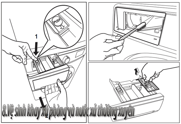 8. Vệ sinh khay xà phòng và nước xả thường xuyên